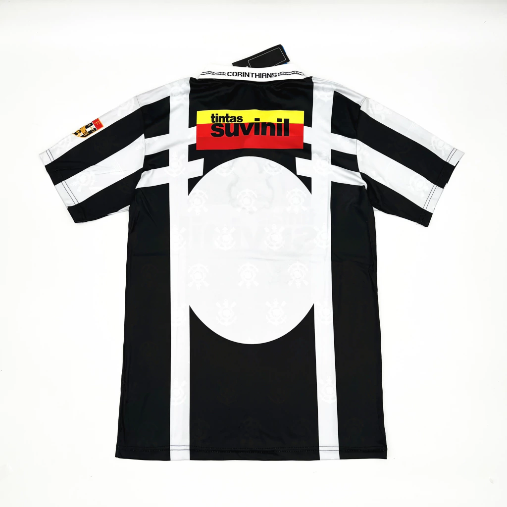 A camisa II do Corinthians 1995/96 é um verdadeiro símbolo dos anos dourados do Timão. Produzida pela Penalty e marcada pelo patrocínio da Tintas Suvinil, ela carrega um design imponente com listras pretas e brancas e gola polo clássica — um visual que marcou época e segue no coração da Fiel até hoje. Vestida por craques como Marcelinho Carioca e Tupãzinho, foi parte de uma geração que consolidou o espírito guerreiro e a identidade corinthiana dentro de campo.